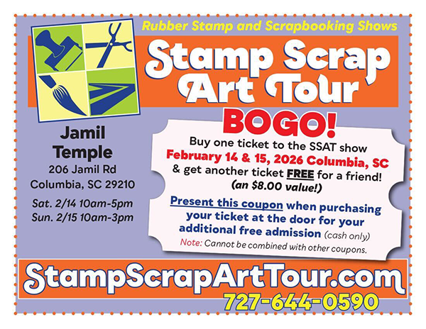 I’ll be a vendor at the Columbia Stamp Scrap Art Tour Saturday 14th and Sunday 15th February. Don’t forget the Friday night Make & Take Session on the 13th (6pm – 9pm). I’ll have my BOGO sale, and a Cash and Carry table for you to shop.